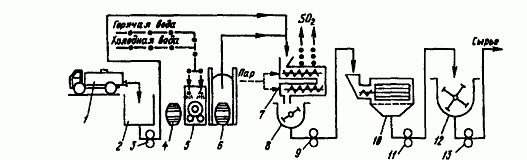Если фруктово-ягодные заготовки поступают несульфитированными, то их в шпаритель 7 не подают. Для хранения используют стальные эмалированные емкости вместимостью до 25 т.