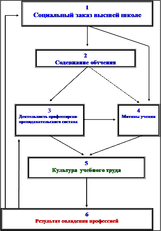 Содержание обучения диктует профессорско-преподаватель-скому составу вуза его конкретные цели в обучении и воспитании будущих специалистов (3). Осознав эти цели, преподаватели, используя имеющиеся в их распоряжении средства, воздействуют на мотивы учебной деятельности студентов (4) и ставят перед ними учебные задачи. На мотивы учебной деятельности студентов непосредственно воздействуют также социальная среда (престиж профессии, ее роль в жизни общества, ситуация на рынке труда, нормы морального и материального вознаграждения) и содержание профессии (предмет, цель, орудия, условия труда и адекватные им знания, умения, навыки).