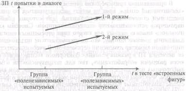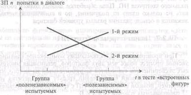 Предположим, что введение 2-го режима в этой компьютеризованной методике образования искусственных понятий повлияло противоположным образом на число осуществленных попыток у испытуемых двух групп. Есть основание считать, что «поленезависимые» испытуемые могли во 2-м режиме увеличить число попыток решения, в то время как «полезависимые» – уменьшить, поскольку первые как бы запутывались в своих попытках, если их направленность не совпадала с направленностью стратегии компьютера (это могло быть следствием их меньшей степени зависимости от полученных в диалоге ориентиров), а для испытуемых 2-й группы ориентировка во внутреннем плане действий облегчалась, поскольку они больше зависят от стимуляции и оказались бы более податливы управляющим правилам диалога, навязываемым компьютером. Учтем, что в условиях 1-го режима диалога «поленезависимые» испытуемые делали меньшее число шагов, чем «полезависимые». Как видно на рис. 10.3, отрезки, фиксирующие тенденции изменения ЗП, пересекаются. Помимо того, что эти данные мысленного эксперимента (реально обсуждались только полученные данные в пользу принятия первой части гипотезы – о неслучайном характере связи времени попытки и времени в тесте Виткина) позволяют продемонстрировать разные виды взаимодействий, они же могут рассматриваться в качестве повода обсуждения проблемы репрезентативности ЗП.