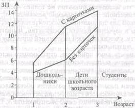 Графическое изображение полученных результатов представлено на рис. 11.1. На абсциссе даны возрастные срезы (реально их было шесть, а не три), на ординате – средние показатели количества правильно воспроизведенных стимульных слов. Две линии представляют результаты в условиях первой и второй серий – без использования и с использованием карточек.