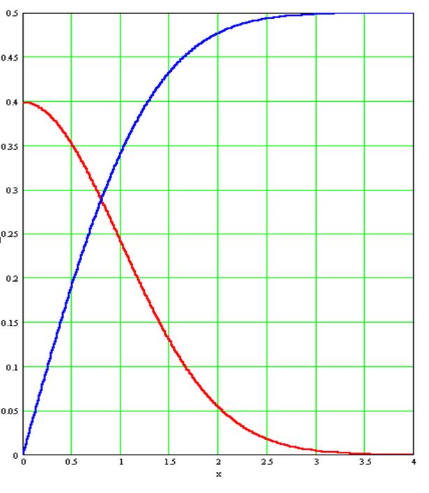 Для расчётов использовать следующий график (возрастающая кривая), на котором по оси абсцисс отложено значение аргумента x Î [0; 4], а по оси ординат – вероятность P(0 ≤ N < x), где N – СВ, распределённая по нормальному закону с МО, равным 0,и СКО, равным 1. При x > 4 считать, что эта вероятность равна 0,5. При x < 0 использовать свойство чётности плотности СВ N (симметрии графика).