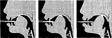 Особенность артикуляции звука х, отличающая его от звука к, состоит в том, что спинка языка не полностью смыкается с нёбом, оставляя по средней линии щель, проходя через которую струя выдыхаемого воздуха вызывает шум, присущий фонеме х (рис. 30).