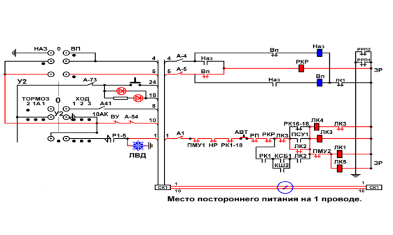 Но, лампа ЛВД продолжает гореть по цепи: любой провод находящийся под напряжением замкнутый с 1-м поездным проводом (постороннее питание), СК1, 1-й провод на пульте управления, лампа ЛВД,,,земля’’. Отключение ВУ обесточивает провод 10АК, а следовательно 5-й поездной провод.