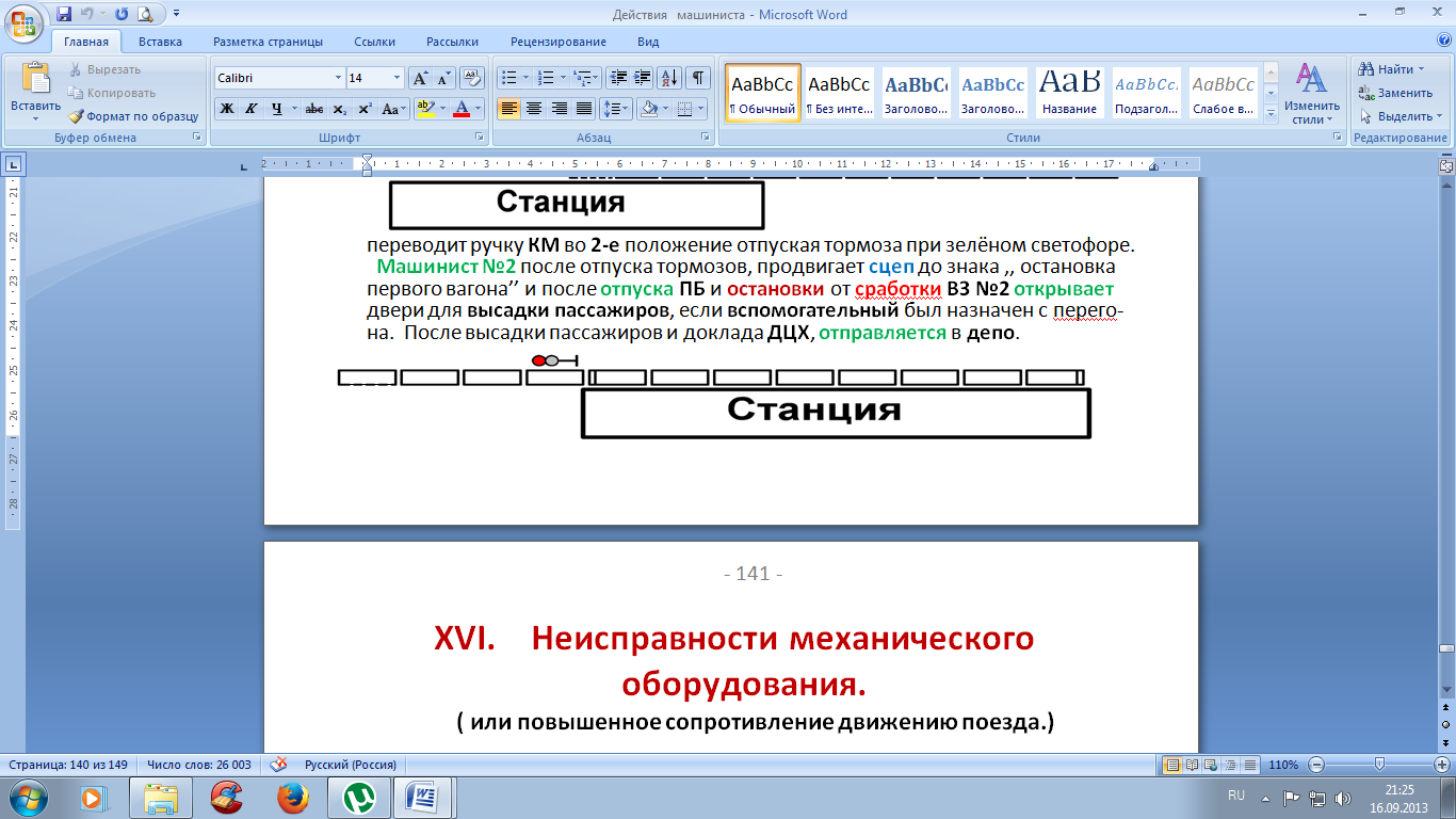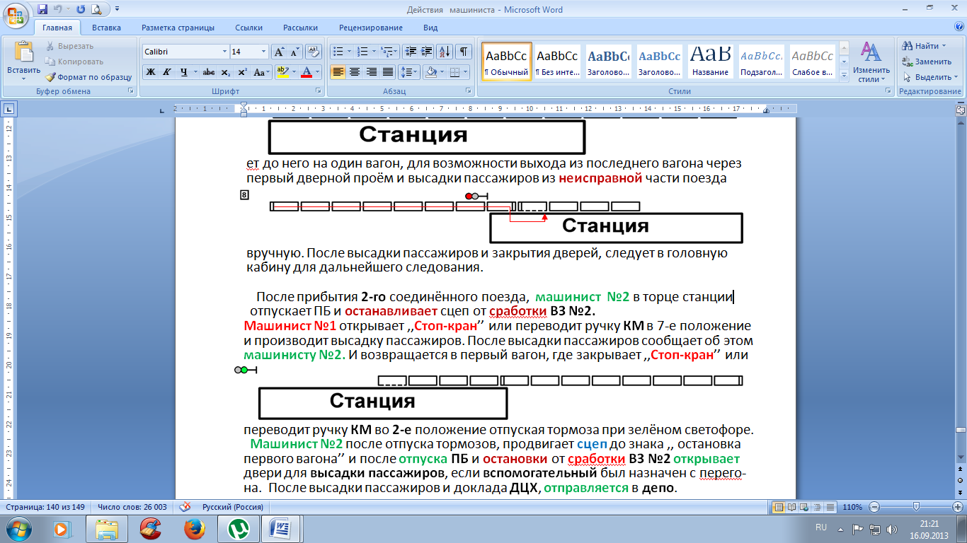 После прибытия 1-го соединённого поезда (сцепа) на станцию, при зелёном выходном светофоре продвигает сцеп до сигнального знака,,8’’, но не доезжает до него на один вагон, для возможности выхода из последнего вагона через
