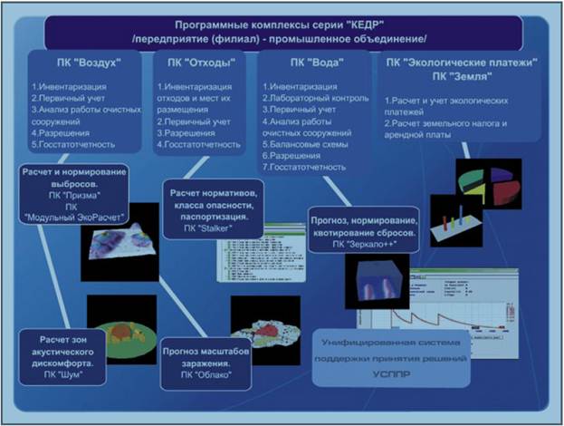 Помимо ПК серии «Кедр», в состав УСППР входят следующие основные расчетно-моделирующие комплексы: ПК «Призма» – автоматизированная расчетная система для выработки решений по управлению качеством атмосферного воздуха; ПК «Зеркало++» – автоматизированная расчетная система для выработки решений по управлению качеством поверхностных водных объектов; ПК «Stalker» – автоматизированная система разработки проектов нормативов образования отходов и лимитов на их размещение (ПНООЛР); ПК «Шум» – автоматизированная система для расчета зон акустического дискомфорта от источников (объектов), оказывающих негативное шумовое воздействие на человека и окружающую среду; ПК «Модульный Эко-Расчет» – расчет выделений (выбросов) загрязняющих веществ (ЗВ) от различных видов производственной деятельности в атмосферу; ПК «Облако» – прогноз масштабов заражения окружающей среды ядовитыми веществами при авариях (разрушениях) на химически опасных объектах и транспорте.