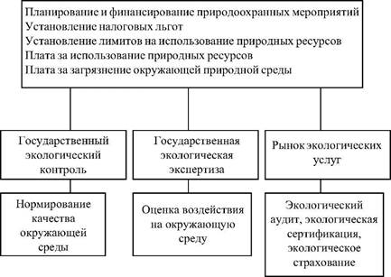 Установление лимитов на изъятие природных ресурсов, на сброс и выброс загрязняющих веществ, а также на размещение отходов, взимание платы за использование природных ресурсов, платы за загрязнение окружающей природной среды; предоставление налоговых, стимулирующих охрану окружающей природной среды льгот осуществляется через систему государственного экологического контроля, государственной экологической экспертизы и создание рынка экологических услуг.