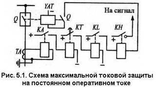 В качестве примера на рис. 5.1 приведена в однофазном изображении принципиальная совмещенная схема аппаратной (релейно-контактной) максимальной токовой защиты на оперативном постоянном токе.