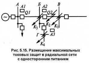 Выбор выдержки времени. Третья ступень токовой защиты, которую принято называть максимальной токовой защитой, может выполняться с независимой и с ограниченно зависимой характеристиками времени срабатывания. И в том, и в другом случае селективность защиты можно обеспечить, если время срабатывания t1III защиты А1 (рис. 5.15), расположенной у источника питания, коротком замыкании в точке К, на смежном участке в зоне действия защиты А2 (линия БВ) больше максимальной выдержки времени t2III защиты А2 на ступень селективности Δt = 0,3...0,5 с. Если для защиты используют реле РТВ, то ступень селективности увеличивают до 1 с.