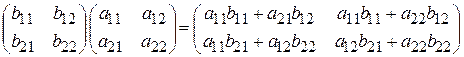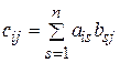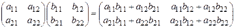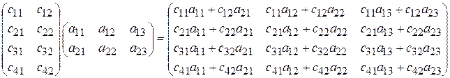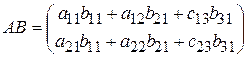 Произведение матрицы А на матрицу В обозначается АВ и называется произведением матрицы А на матрицу В справа или произведением матрицы В на матрицу А слева. Из (1.10) следует, что элемент матрицы АВ, находящийся в i -й строке и j -м столбце равен сумме произведений элементов i -й строки матрицы А на элементы j -го столбца матрицы В.