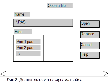 Клавиша Open в диалоговом окне используется для команды чтения файла, ее действие аналогично нажатию клавиши Enter. Клавиша Replace используется для замены существующего в поле имени файла на имя из поля выбора. Нажатие клавиши Cancel отменяет команду вызова файла, клавиша Help вызывает справочную систему диалогового окна.