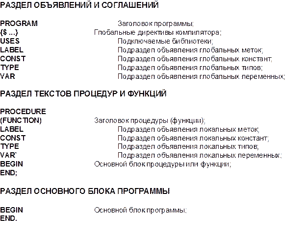 Программы для языка Турбо-Паскаль должны подчиняться строго определенной структуре, схема которой показана на рис. 9. В программе должны четко выделены три основные части: