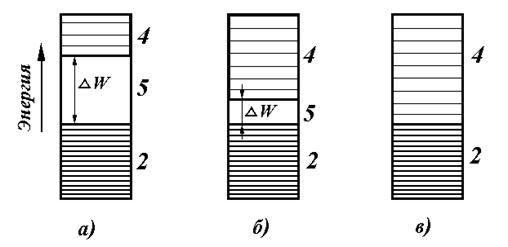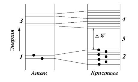 Когда из отдельных атомов образуются молекулы, а из молекул образуется вещество, все имеющиеся у данного типа атома электронные уровни (как заполненные электронами, так и незаполненные) несколько смещаются вследствие действия соседних атомов друг на друга. Таким образом, из отдельных энергетических уровней уединенных атомов в твердом теле образуются целые полосы – зоны энергетических уровней (рис.1.2). Нормальные энергетические уровни 1 образуют заполненную электронами зону 2. Уровни возбужденного состояния атома 3 образуют свободную зону 4. Между заполненной зоной и свободной зоной располагается запрещенная зона 5.