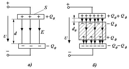 Если теперь между обкладками конденсатора поместить диэлектрик (рис.2.1,б), то имеющиеся в диэлектрике связанные заряды смещаются в направлении действующих на них сил электрического поля. При снятии электрического поля заряды вернутся в свое прежнее состояние. Расстояние