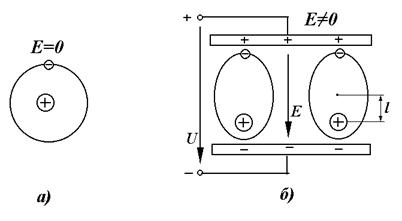 Рис.2.2. Электронная поляризация диэлектрика. Положение орбит электронов при отсутствии электрического поля (а) и при наличии электрического поля.