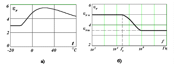 Рис.2.5. Зависимость относительной диэлектрической проницаемости от температуры (а) и частоты (б) для полярной жидкости – совола.