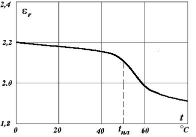 Рис.2.7. Зависимость диэлектрической проницаемости от температуры для неполярного диэлектрика – парафина.