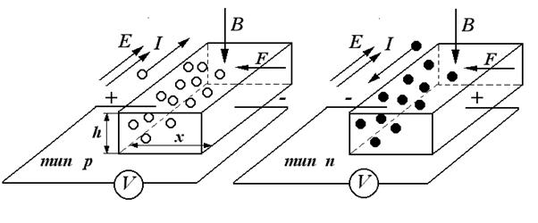 Пластина из полупроводника помещается во внешнее поперечное магнитное поле, с индукцией B. По направлении длины полупроводника прикладывается разность потенциалов, создающая напряженность E электрического поля.Под действием этого поля в полупроводнике возникает электрический ток, т.е. возникает направленное движение электрических зарядов. Магнитное поле действует на движущиеся заряды с некоторой силой. Эта сила смещает движущиеся носители заряда к одной из граней пластины полупроводника. Вследствие этого и возникает поперечная ЭДС, которую измеряют вольтметром V. Направление смещения зарядов определяется по правилу «левой руки», относящемуся к техническому направлению тока. Положительным направлением тока считается направление движения положительных зарядов, т.е. направление, противоположное направлению дрейфа электронов. Из рис. 2.9видно, что при изменении типа электропроводности меняется и полярность напряжения на вольтметре.