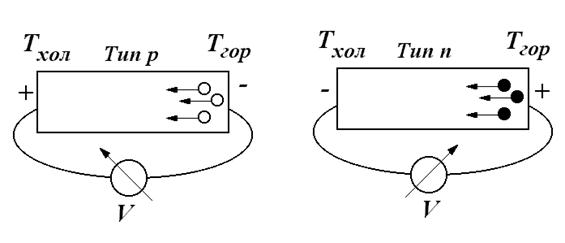 Если испытывается полупроводник р- типа, то в нагретом конце за счет затраты тепловой энергии большее число электронов будет переброшено из заполненной зоны на акцепторные уровни примесей по сравнению с холодным концом. На горячем конце возникает избыточная концентрация дырок. Из горячего конца в холодный начнется диффузия дырок, и он окажется заряженным отрицательно по отношению к холодному концу. Полярность концов полупроводника, а следовательно, и тип электропроводности определяется с помощью вольтметра V.