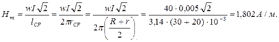Пример 5.5. Tороидальный сердечник имеет размеры: наружный радиус R =50мм, внутренний радиус r =20мм, высота h =10мм. На сердечник намотана обмотка, содержащая w =40 витков. К обмотке приложено напряжение U =0,5В частотой f =1000Гц. Ток, протекающий по обмотке I =0,005А. Вычислить магнитную проницаемость материала, из которого изготовлен сердечник, пренебрегая активным сопротивлением обмотки и потерями в сердечнике и при условии, что сердечник не насыщен.