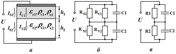 Изоляционная конструкция высокого напряжения состоит из двух слоев различных изоляционных материалов (рис.1,а). Материал первого слоя имеет относительную диэлектрическую проницаемость