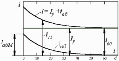 Ток абсорбции изменяется с течением времени t по закону затухающей экспоненты (рис.2):