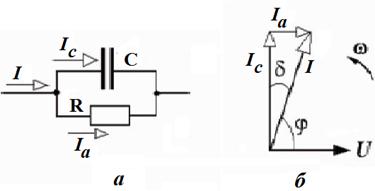 Рис.4. Схема замещения (а) и векторная диаграмма (б) диэлектрика с потерями при переменном напряжении