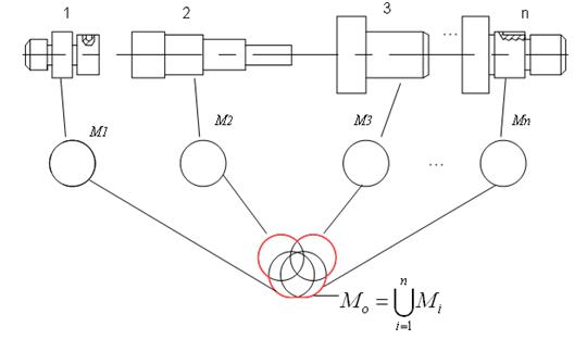 Каждая деталь из группы конструктивно подобных имеет свой собственный маршрут обработки, которому соответствует упорядоченное множество M i. Часть технологических преобразований общая, а часть индивидуальная. Обобщенную структуру формируют как объединение множеств M i маршрутов обработки всех n деталей, входящих в группу. Пересечению этих множеств соответствуют общие технологические преобразования, имеющиеся у всех деталей.