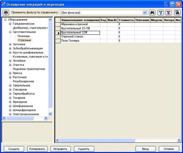С помощью указанных клавиш выполняется первая ступень фильтрации – открывается соответствующий раздел справочника «Оснащение операций и переходов».