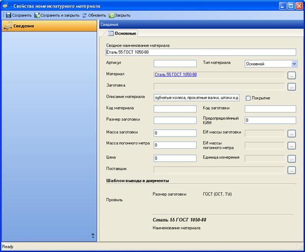 При поставке системы в БД вводится обширная база всех материалов, используемых на просторах СНГ, с указанием всех ГОСТ-ов, адресов поставщиков и их телефонов. Фактически на предприятии работают с узким числом поставщиков материалов, поэтому технолог должен создать собственную базу данных материалов. При этом частично можно взять материалы из системы, частично приходится вводить свои новые.