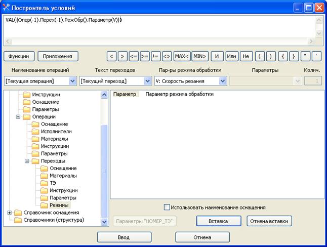 В системе используются переменные двух типов – внутренние и внешние. Внутренние переменные существуют только внутри расчёта. Например, {А}, {D}, {VREZ}. Имена переменных вы даёте по смыслу. Внутренние переменные имеют гораздо более сложный синтаксис чем внешние. Например, {Опер (-1). Перех(-1). РежОбр(). Параметр (V)}. (-1) означает – текущие операция и переход.