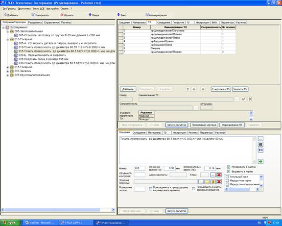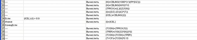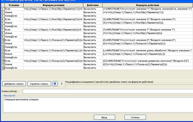 После ввода всех данных в расчёт можно вводить команды вычислений. Например, фрагмент программы по расчёту режимов резания, основного и вспомогательного времени может выглядеть так:
