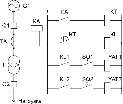 Принципиальная схема МТЗ двухобмоточных понизительных трансформаторов представлена на рис. 9.5.2. По соображениям надежности целесообразно воздействовать на оба выключателя Q1 и Q2, с тем, чтобы при внешних КЗ один выключатель резервировался вторым.