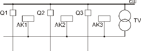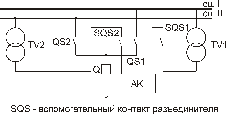 При переключении присоединений с одной системы шин на другую необходимо производить переключение питания её защит на ТН другой системы шин. Обычно такое переключение делается автоматически при операциях с разъединителями (рис. 6.1.3).
