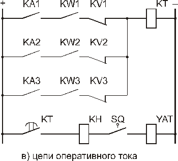 На рис. 7.4.1 приведена принципиальная схема максимальной направленной защиты с двумя пусковыми органами: тока и минимального напряжения и однофазными реле направления мощности, включенными по 90° схеме.
