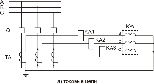 На рис. 7.4.2 представлена принципиальная схема максимальной направленной защиты с токовым пусковым органом и трехфазным реле направления мощности, включенным по 30° схеме.