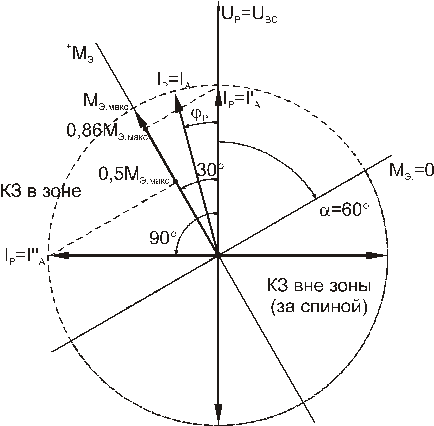 Из анализа векторной диаграммы можно сделать вывод, что работа реле при трехфазном КЗ в зоне и вне зоны действия будет правильной и величина электромагнитного момента МЭ вполне достаточной для действия реле.