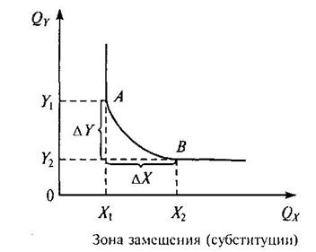 Зона замещения (субституции) – участок кривой безразличия, на котором возможна эффективная замена одного блага другим.