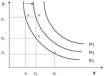 Карта безразличия – совокупность кривых безразличия, соответствующих различным уровням полезности для одного потребителя и одной пары благ. Вкусы и предпочтения потребителя представляются картой кривых безразличия. Каждая следующая кривая безразличия, проходящая дальше от начала координат, предполагает относительно большую величину полезности.