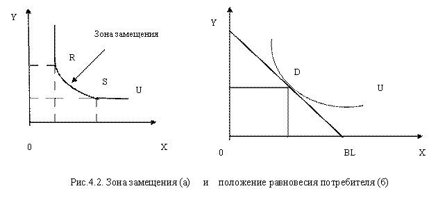 На кривой безразличия зона замещения обозначена отрезком RS (рис. 26.6). Взаимная замена благ Х и Y имеет смысл только в пределах отрезка RS. Вне отрезка замена исключается. Два блага выступают как независимые друг от друга.