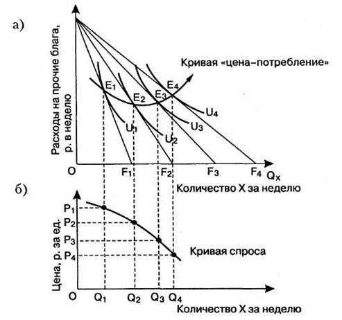 Кривая "цена-потребление" и кривая спроса – это два различных метода изображения того, каким образом приобретаемый объем блага изменяется при изменении цены блага и прочих равных условиях.