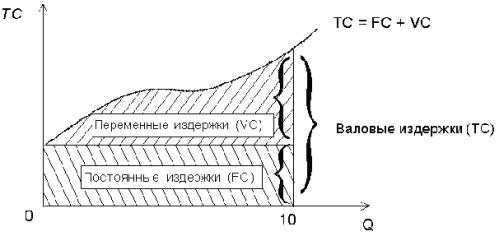 Общие, или валовые, издержки (total cost, TC) – издержки в целом при данном объеме производства. Они равны сумме постоянных и переменных издержек: ТС = FC + VC.