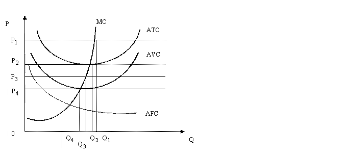 Р4 < AVC В этом случае фирма будет работать, т.к. покрываются ее средние постоянные издержки. Если цена опуститься ниже уровня Р4, фирма прекратит производство и выйдет из данной отрасли.