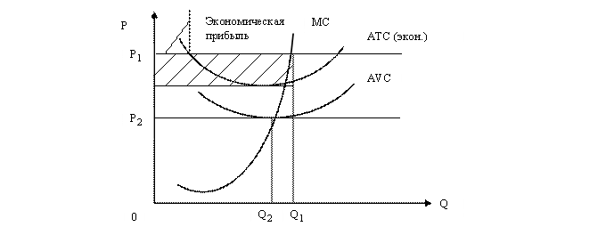 Наилучшим результатом для фирмы в краткосрочном периоде является экономическая прибыль. Кривая предложения фирмы, стремящейся максимизировать прибыль в условиях совершенной конкуренции, совпадает с возрастающей частью кривой предельных издержек, лежащей выше точки минимума средних переменных затрат. При выпуске Q1 фирма получает экономическую прибыль. Если цена опуститься до уровня P2, то объем Q2 позволит минимизировать убытки в краткосрочном периоде. P2 = AVC, что является условием минимизации убытков. Для длительного периода получение экономической прибыли невозможно, т.к. в условиях свободного входа и выхода из отрасли высокая прибыль привлекает в данную отрасль другие фирмы, а убыточные фирмы уходят из отрасли.