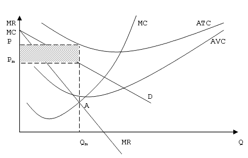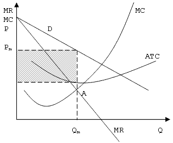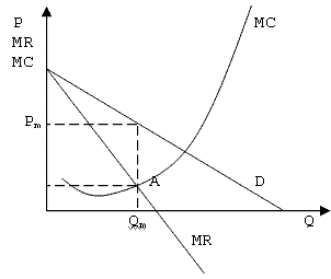 Объем выпуска, максимизирующий прибыль монополиста, определяется точкой пересечения кривых MR и MC. После того, как найден оптимум Q m, фирма использует кривую спроса для нахождения монопольной цены P m. Таким образом, условие равновесия монопольной фирмы: