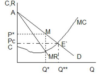 Производство любого количества сверх оптимального сократило бы экономическую прибыль монополиста, которая может быть подсчитана как сумма прибылей от каждой реализованной единицы, что на рисунке соответствует заштрихованной площади АСЕ. Потребительский излишек, т.е. разница между суммой, которую покупатель готов был заплатить, и рыночной ценой Р*, изображен верхним треугольником АР*М.