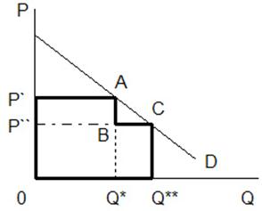 Предположим, что монополист устанавливает две цены: при объеме от 0 до Q* цена Р', при объеме от Q* до Q** цена Р''.