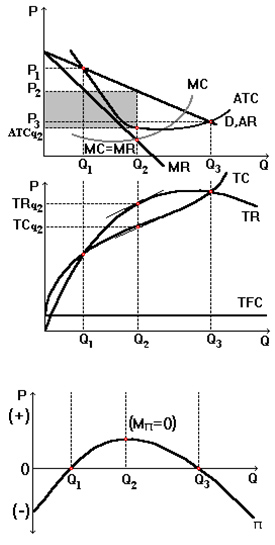 Если МR>МС, т.е. пока каждая дополнительная единица выпуска увеличивает доход, а не издержки, прибыль от этой единицы (предельная прибыль) будет положительной, и рост объема выпуска вызовет дополнительное увеличение совокупной прибыли. Если же MR<МС, то предельная прибыль будет отрицательной, и совокупная прибыль будет увеличиваться лишь за счет сокращения объема выпуска.