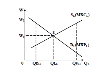В случае превышения ставкой заработной платы уровня равновесной (случай W1) предложение на рынке труда превышает спрос. Следовательно, возникает избыток предложения труда (QLS1-QLD1) или безработица. В случае снижения заработной платы, по сравнению с равновесной, спрос на рынке превышает предложение, таким образом, возникают незанятые рабочие места.