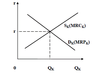 Согласно неоклассической теории равновесие на рынке капитала достигается, когда предельная производительность капитала (MRPк) равна предельным издержкам собственников капитала (MRCк), связанным с отказом от использования капитала в настоящее время. Процентная ставка, определяемая пересечением линий MRP и MRC, называется равновесной процентной ставкой (рис. 38.3).
