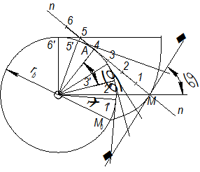 Пусть производящая прямая (рис. 1.27) n – n показана в положении, когда она касается основной окружности в точке А и требуется построить эвольвенту, описываемую т. М. Делим отрезок AM на равные части и откладываем на